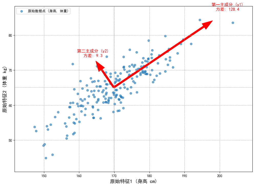 原始数据:假设一下二维平面上有一堆散点,代表了学生的(身高,体重)数据。这些点可能呈一个斜向上的椭圆形分布,这正体现了身高和体重的相关性。我们用原始的坐标轴(身高轴,体重轴)来描述这些点。