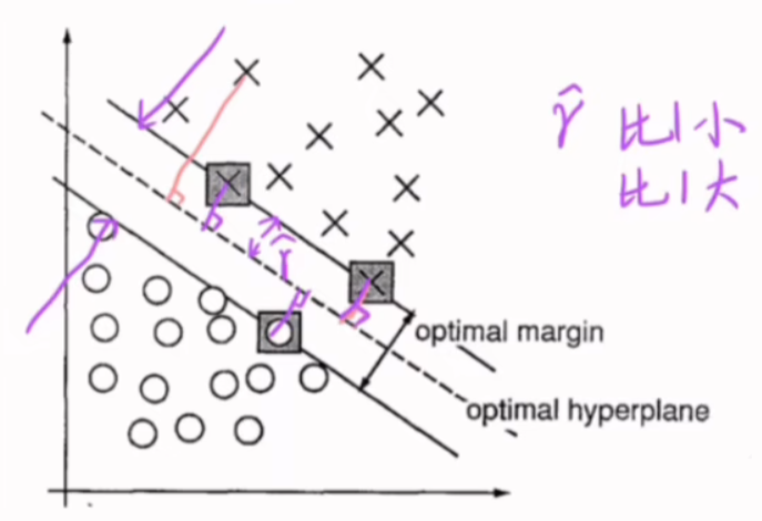 • 由于函数间隔 可以通过缩放 来任意改变,我们可以选择一个特定的缩放因子,使得距离超平面最近的那些点(被称为支持向量)的函数间隔恰好为 1。
