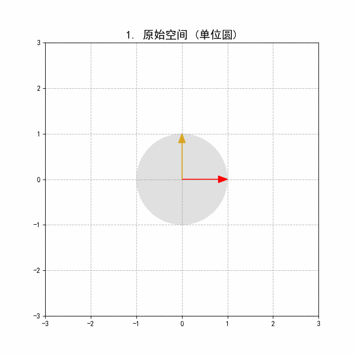 - 沿着对齐后的坐标轴进行不同程度的拉伸或压缩,将单位圆变成一个椭圆。
