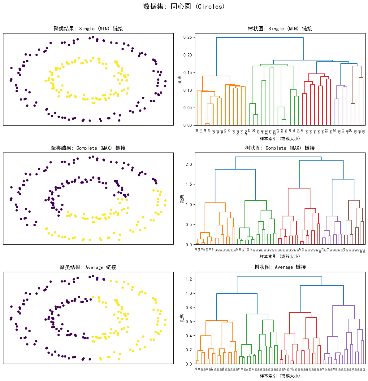 - 难以处理非球形簇(除了单链接): 大多数链接准则(如全链接、Ward)倾向于发现球状簇。